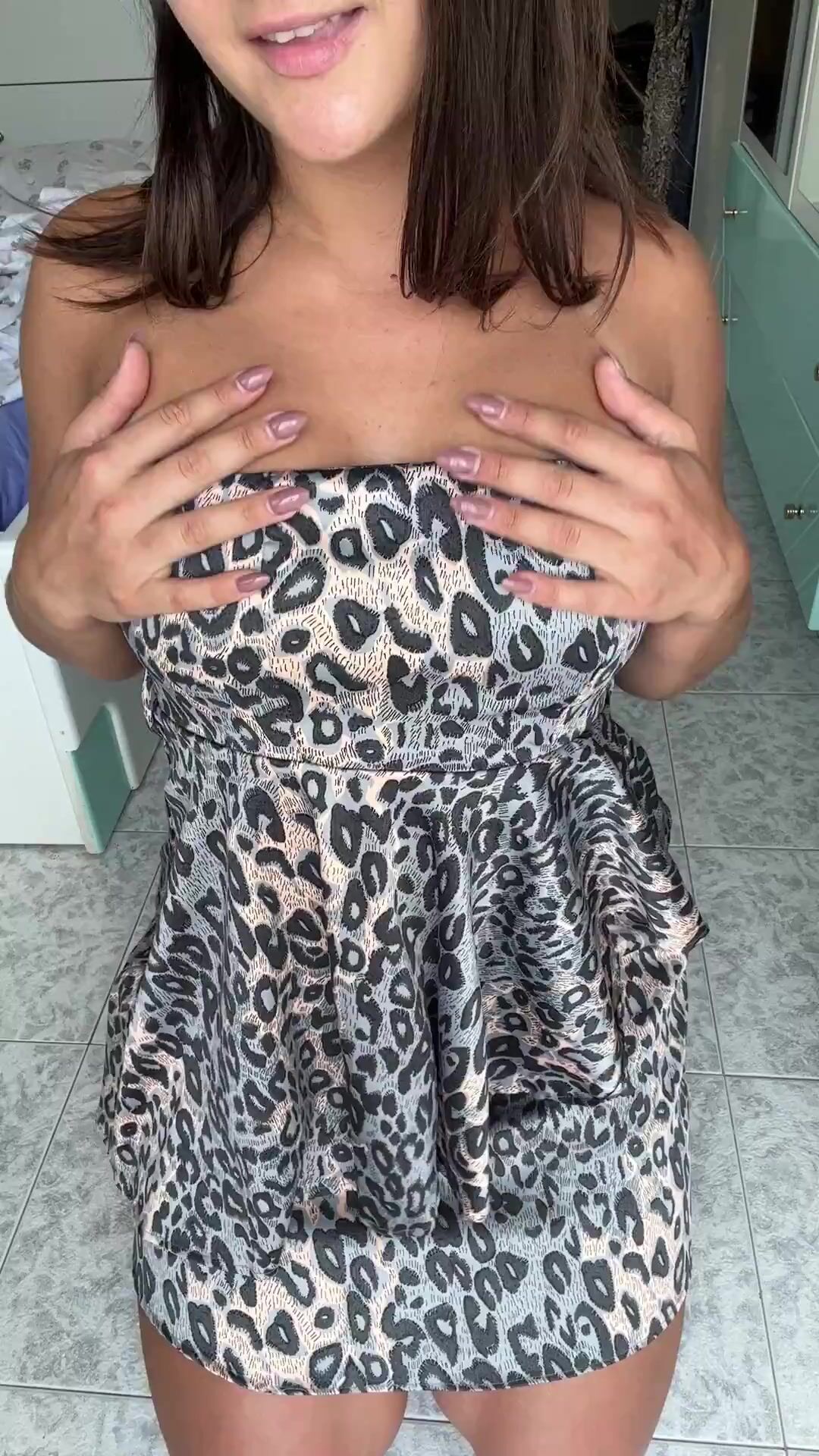 Horny wife squeezing her boobs in leopard dress