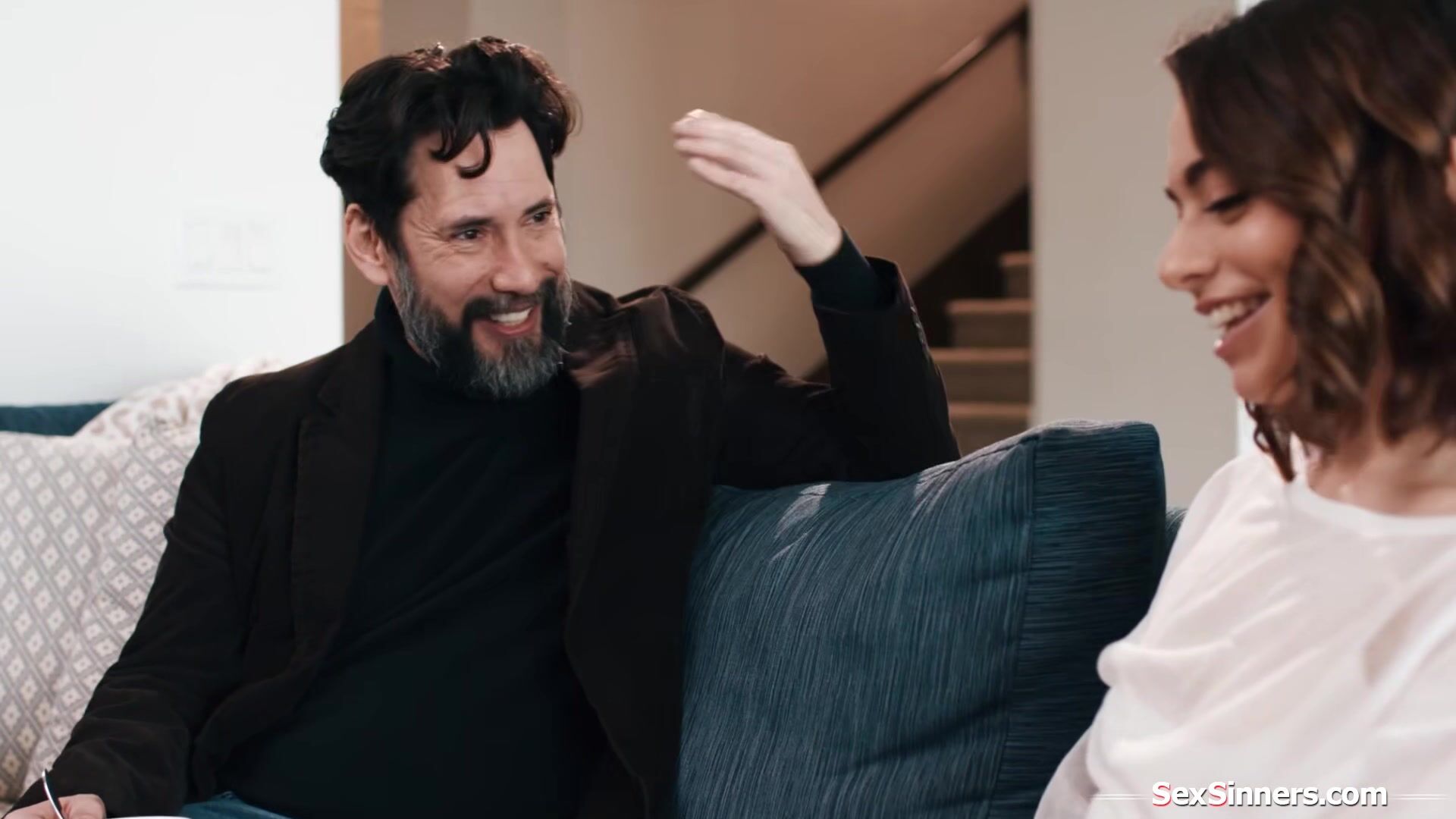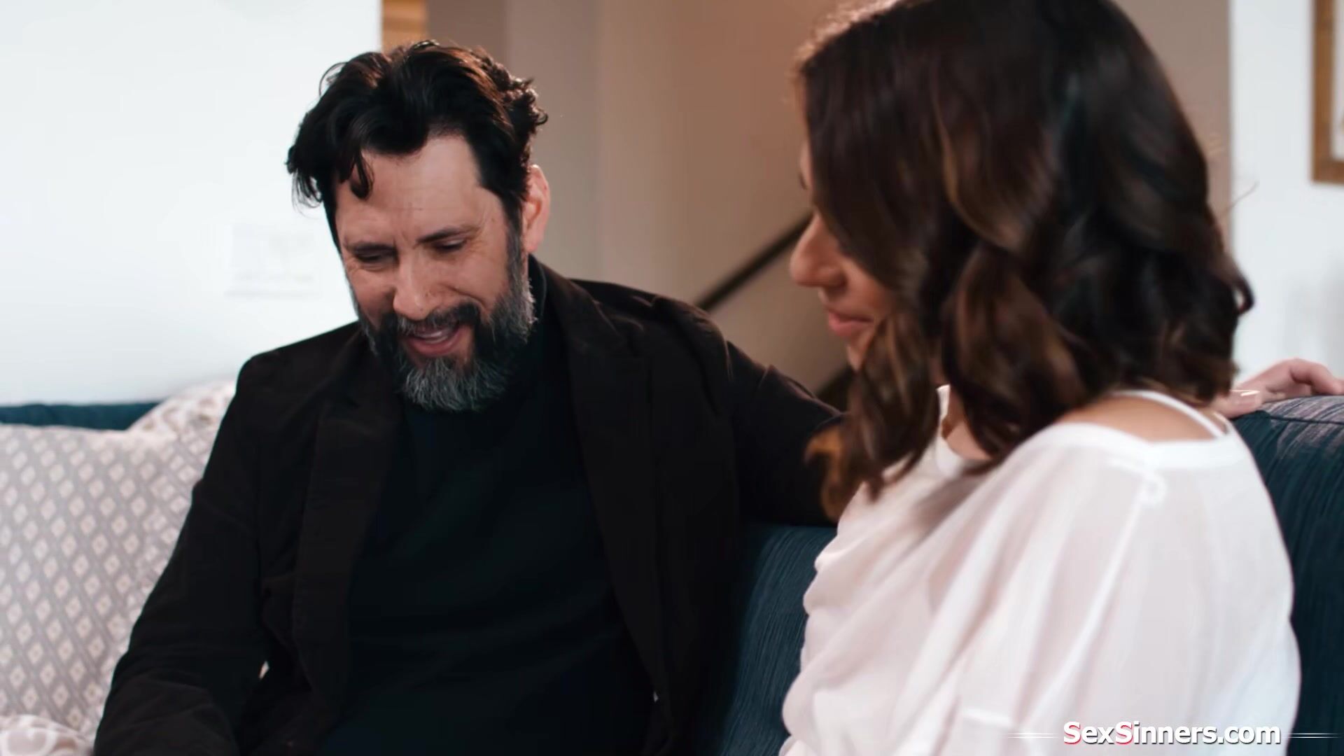 Sophia Burns gets a surprise visit from former bffs husband for a talk.The issues he has make them reconnect and they cant hold back anymore.The small tits brunette is masturbated and licked.She puts his cock and balls in her mouth before riding him