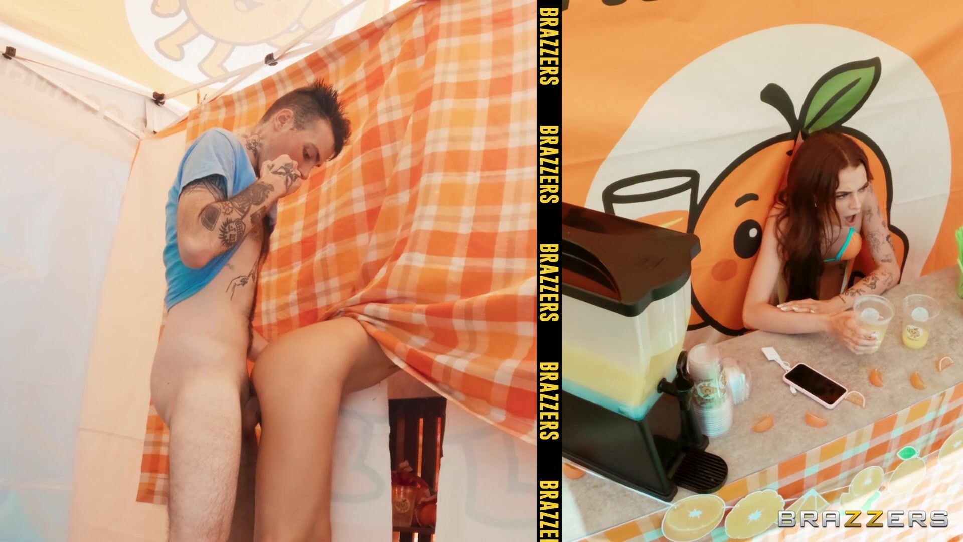 Petite Nikki Nicole is running her Big 'O' Orange stand before a crowd of greedy customers. The customers might be thirsty for orange juice, but horny Nikki is thirsty for some cock! Let’s see how far Nikki can take sneakily fucking tattooed Logan Xander right there at her stand, before the customers catch on.